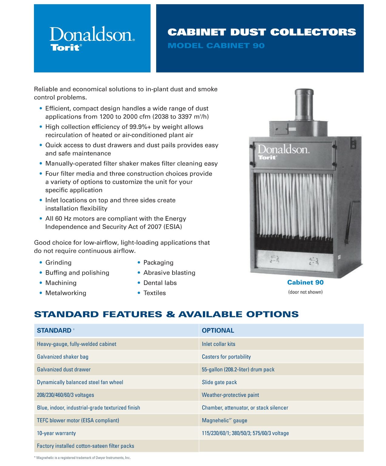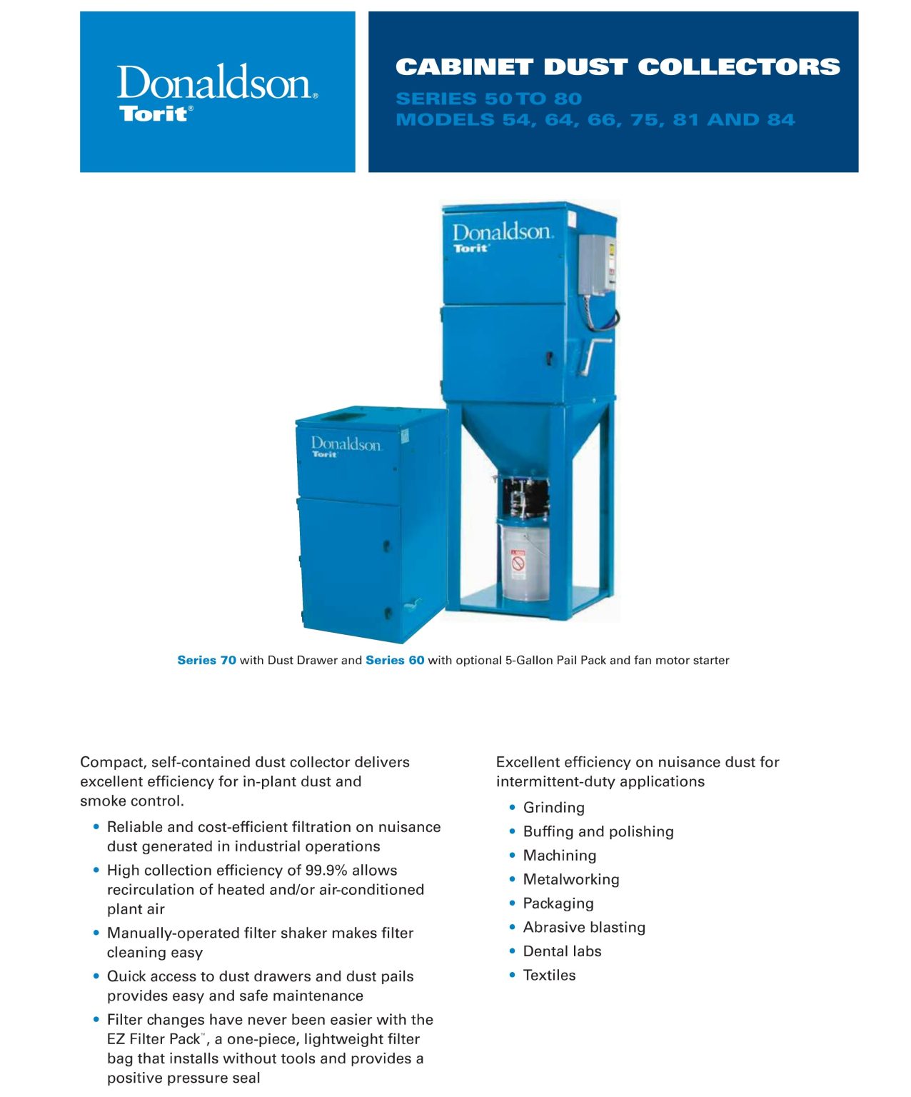 唐纳森 Torit® 橱柜除尘器高效紧凑的设计适用于广泛的袋式除尘器应用场合。 一体式 EZ Filter Pack™*,使除尘器滤袋更换变得更简单。