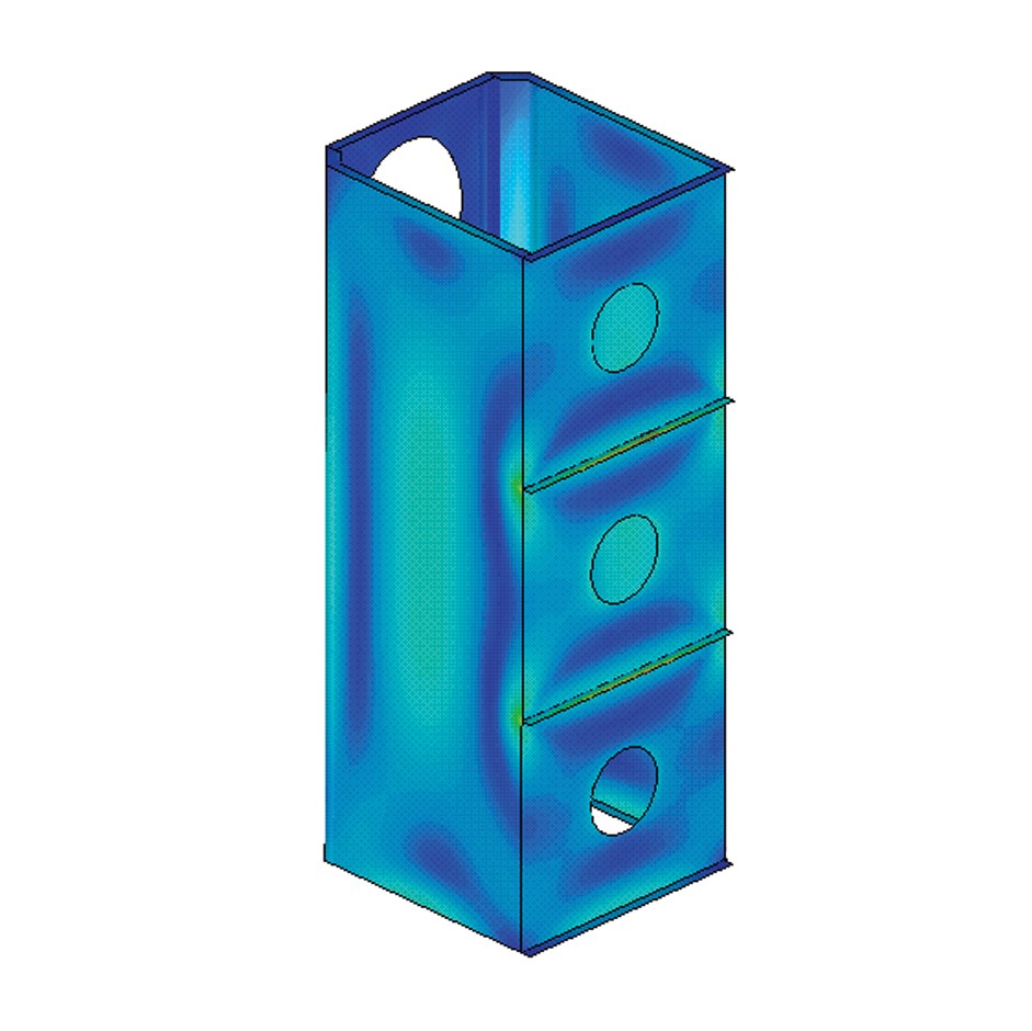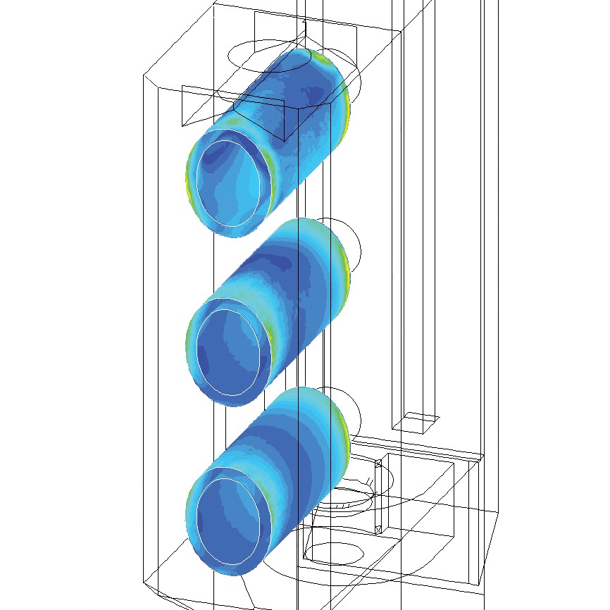 使用先进的流体动力学、结构力学和声学计算机建模,分别模拟了 DFO 型号 1-1、2-2 和 3-3 的技术等级。 下图(左侧)显示了如何利用 FLUENT 流量建模软件使 DFO 3-3 型号内部的气流速度分布更为均匀。 下图(右侧)所示的 ANSYS® 结构分析软件证明在常规运行压力下,DFO 3-3 型号的应力水平和偏度都最小。