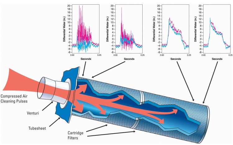 ExtraLife 滤芯清灰系统采用专利的计算机建模脉冲清灰技术,可轻松将滤芯表面的粉尘“通过脉冲清灰清理干净”,从而提高过滤效率,延长滤芯使用寿命。 图中的红色曲线显示 ExtraLife 系统在 Downflo 前排滤筒产生的压力增加。 而蓝色曲线则表示标准滤筒式除尘器的脉冲反吹表现。