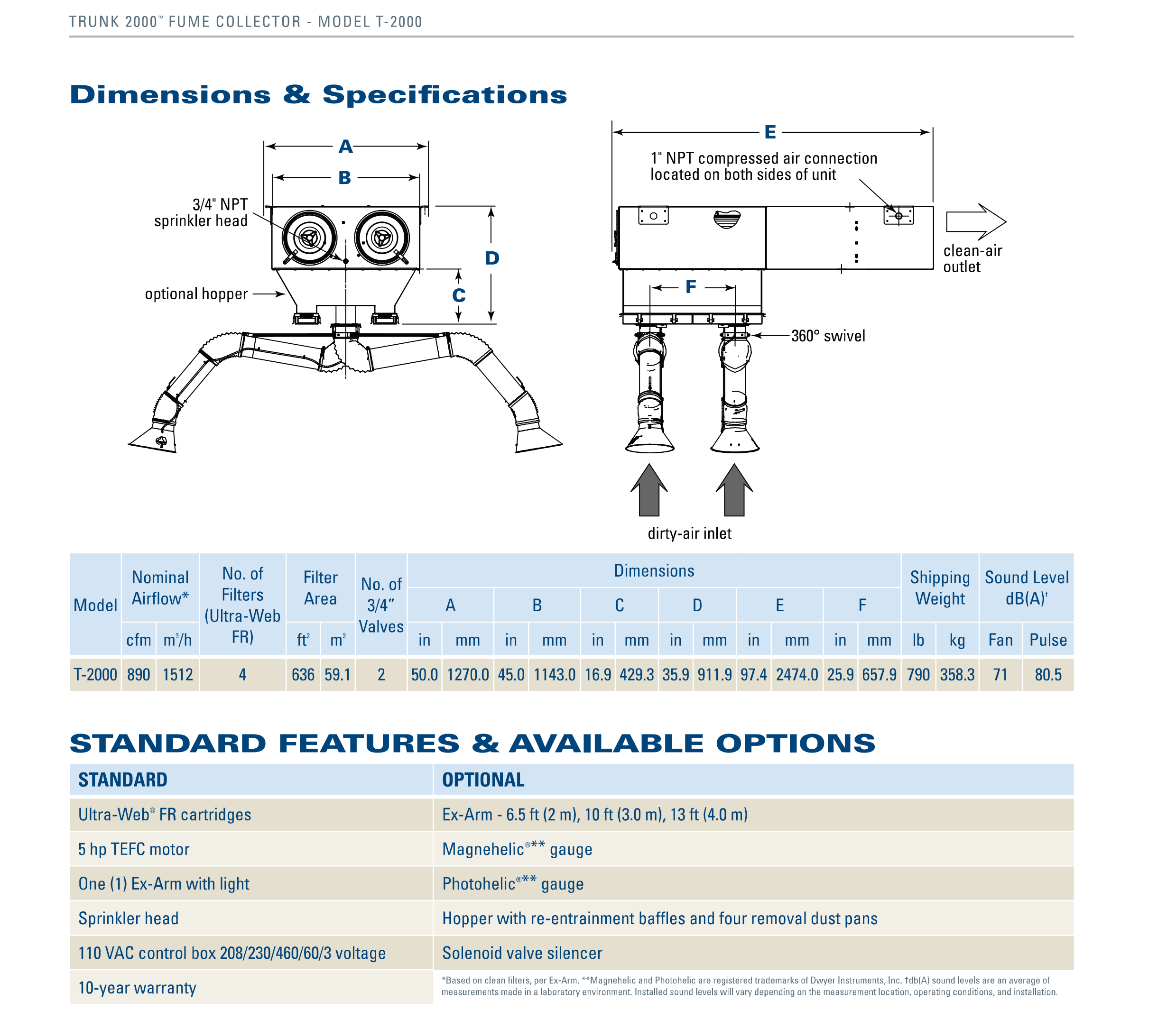 Torit® Trunk 2000 (T-2000) 源烟除尘器是一种自给式焊烟除尘器,旨在用于捕获中重型焊接应用产生的烟。通过使用灵活的吸尘臂来处理一个或两个焊接站。 顶置设计节约了宝贵的工厂占地空间,并提供了吸尘臂的适合幅度。
